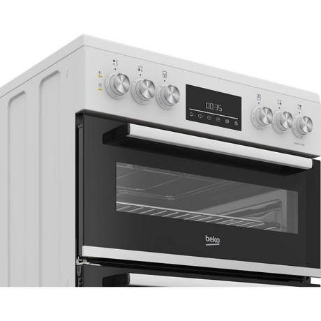 Introducing the Beko EDC6731W, a 60cm double oven electric cooker that brings both style and functionality to your kitchen with its elegant white finish. Featuring a vitroceramic hob, this appliance ensures even heat distribution for perfect cooking every time. Perfect for families and culinary enthusiasts alike, it allows you to cook multiple dishes simultaneously, saving valuable time.