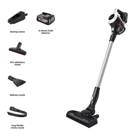 1 x XXL upholstery nozzle, 1 x XXL crevice nozzle, 1 x mattress nozzle, 1 x charger, 2 x exchangeable battery pack, 1 x docking station |