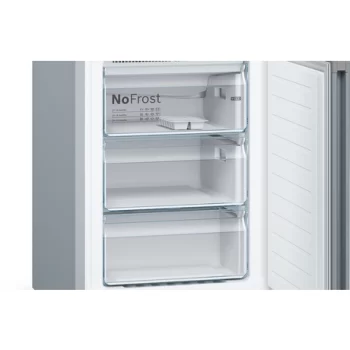 The Bosch KGN392LEBG fridge freezer offers VitaFresh technology, keeping your food fresh for longer in climate-controlled drawers at around 0°C. The Easy Access Shelf allows you to quickly find items, while the Perfect Fit design enables placement next to walls or other appliances to save space.