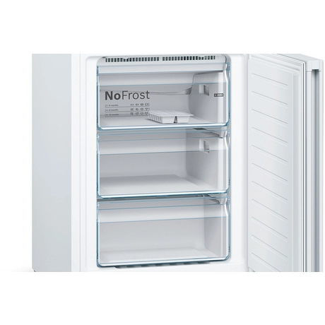 The Bosch KGN392WEBG fridge freezer is designed to keep food fresher for longer with VitaFresh technology, offering climate and temperature control for optimal storage. The Easy Access Shelf ensures you can reach every item with ease, while LED lighting provides clear visibility.