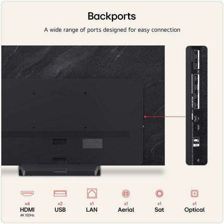 Supporting DVB-T2, DVB-C, and DVB-S2 digital tuners with a coaxial antenna, this model adapts to various broadcast standards for flexible viewing. Its combination of advanced technology and practical design makes it an ideal choice for upgrading your home entertainment system with exceptional picture quality, smart features, and superior user convenience.